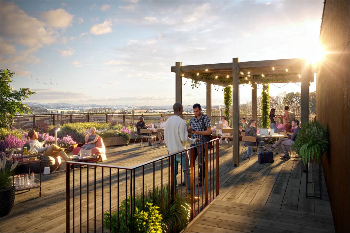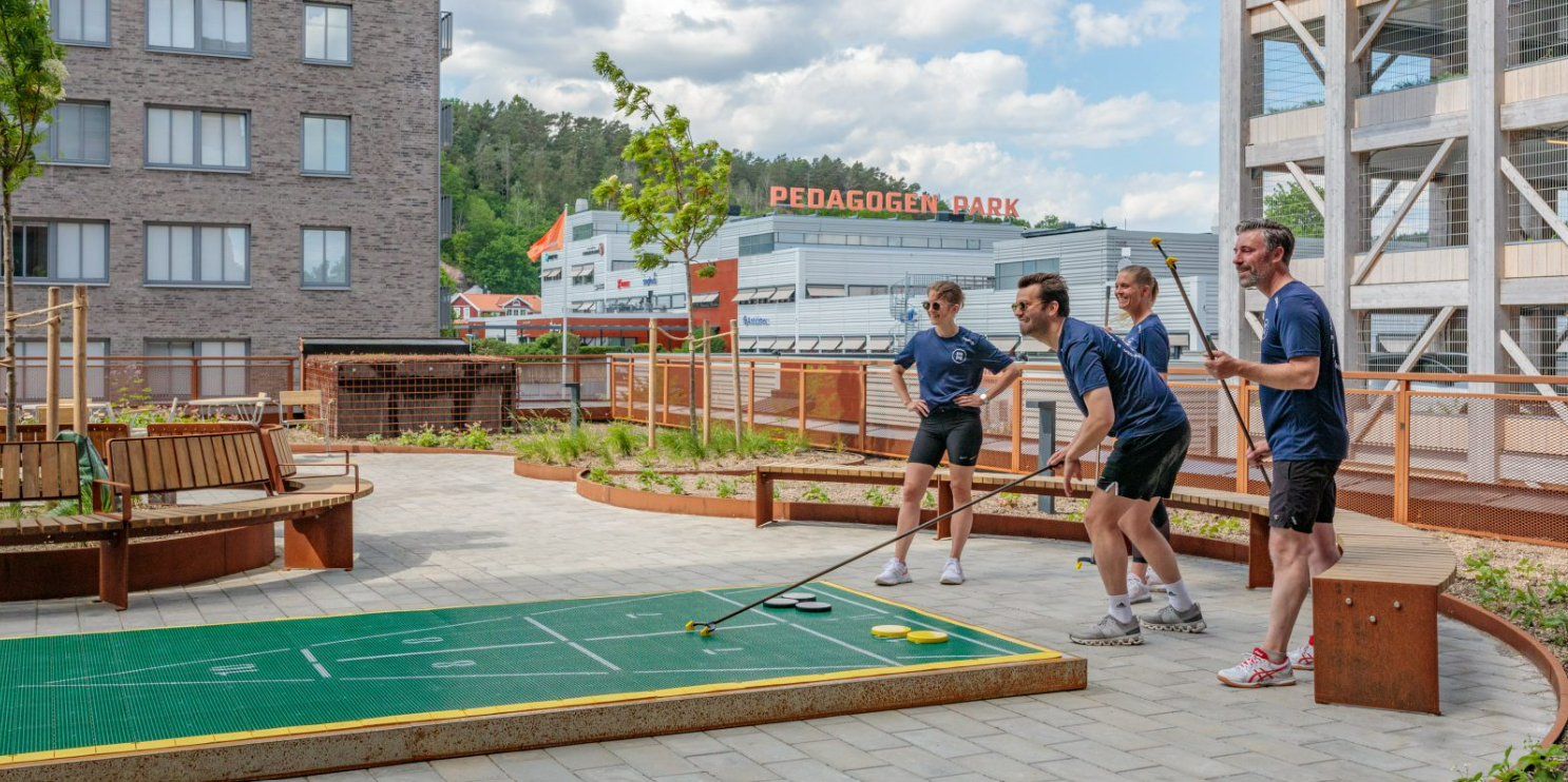 Parkhus 4 är designat för att skapa energi och möjliggöra möten. På plan 2 hittar ni en unik aktivitetsterrass med padelbana, shuffleboard och pingis – perfekt för en lunchmatch eller ett kundevent. För er som föredrar andra former av motion ligger Änggårdsbergen med sina vackra motionsspår precis runt hörnet. Dessutom erbjuds kostnadsfri cirkelträning på måndagar för alla hyresgäster, och för de som vill träna på gym finns Nordic Wellness i närheten. Högst upp i huset finns en gemensam takterrass där ni kan njuta av vildblommor och smultron, och kanske en god take away-lunch under varma sommardagar.
