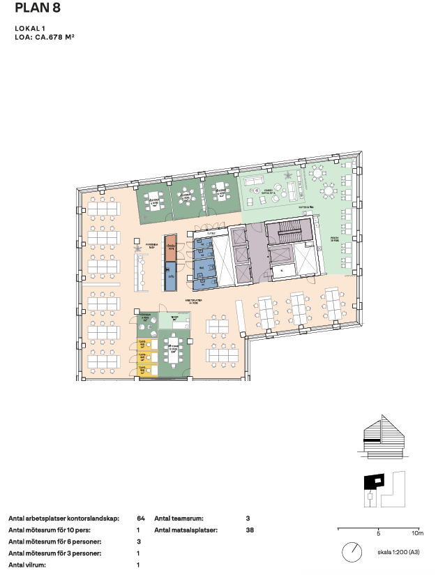 Lokalen erbjuder fem mötesrum i varierande storlekar, samt tre teamsrum för digitala möten, vilket gör den idealisk för både traditionella och hybrida arbetsmöten. Kontorslandskapet har plats för upp till 64 arbetsplatser, och varje arbetsplats har en storslagen utsikt, oavsett vilket håll man vänder blicken. Låt dig inspireras genom att blicka in i det arkitektoniska konstverkets centrum eller välj att njuta av den fantastiska utsikten över älven.