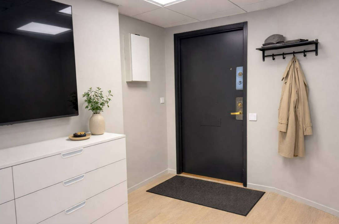 Planlösningen består av ett öppet kontorslandskap, ett mötesrum samt ett trivsamt pentry med plats för paus eller informella möten. Entrén är rymlig och välkomnande, vilket ger ett professionellt intryck för både kunder och medarbetare.