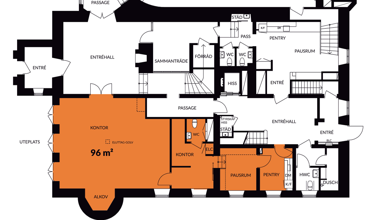 Lokalen har en trivsam planlösning och erbjuder en personlig karaktär med fina detaljer från byggnadens ursprung. En stor fördel är den egna utgången till trädgård, vilket skapar en extra dimension till arbetsmiljön och möjliggör både pauser och informella möten i en lugn och grön omgivning.